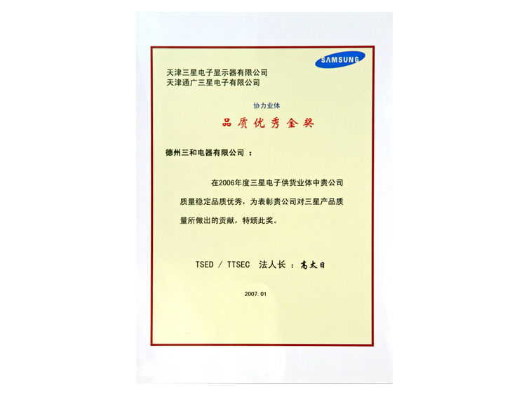 三星金獎(jiǎng)證書